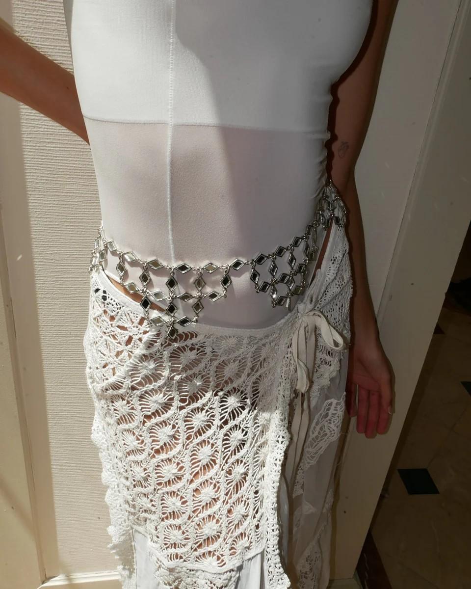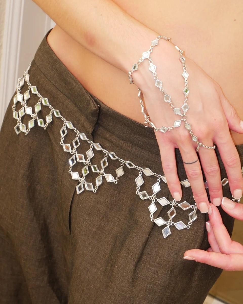 Cinturón articulado elaborado en latón con baño de plata, con pequeños espejos engarzados a mano en forma de rombos que dibujan olas. Es nuestro best seller reinventado, aún más impactante.