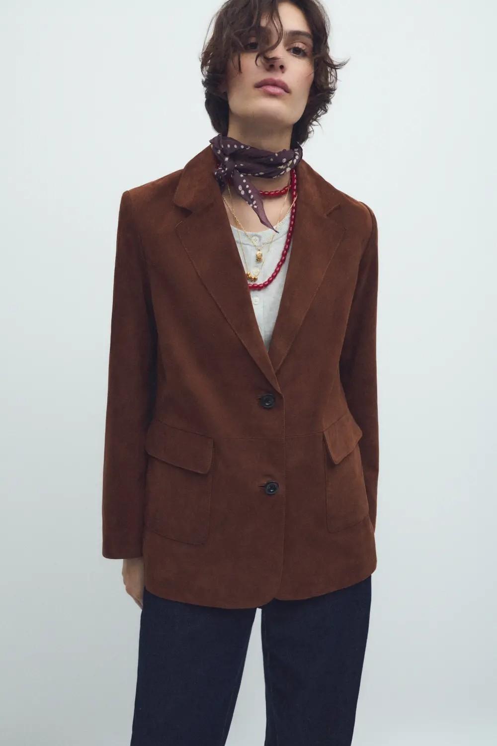 Blazer de 100% piel suede en color marron tostado. Elige tu talla habitual. Si dudas entre dos tallas, elige la más grande.