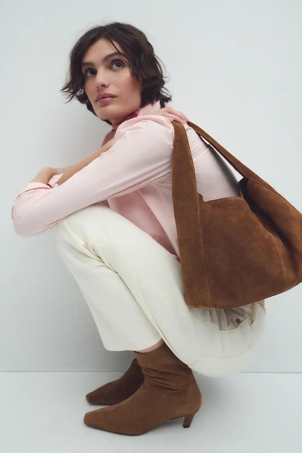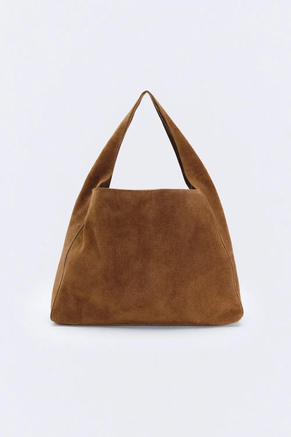 Bolso de hombro de suede con detalle de costura central. Cierre con imán. Bolsillo interior con cremallera. En color marrón.
