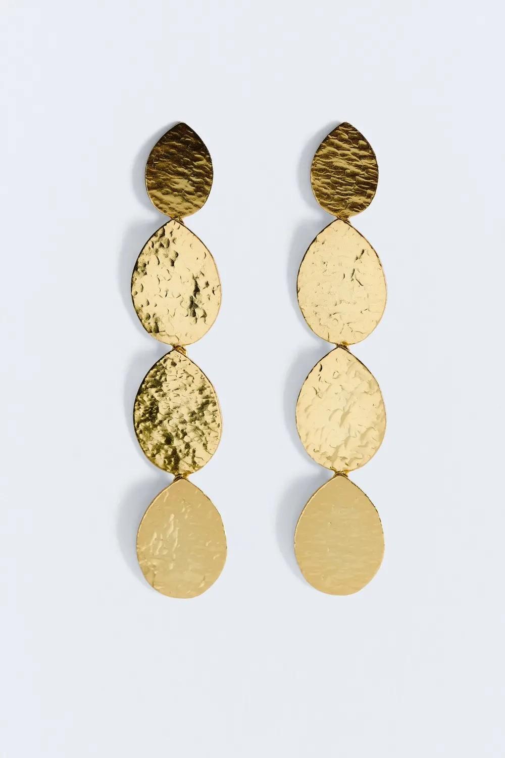 Pendientes de latón bañados en oro. Con diseño de 4 gotas aplanadas con acabado orgánico. En color dorado. Medidas: 8cm.