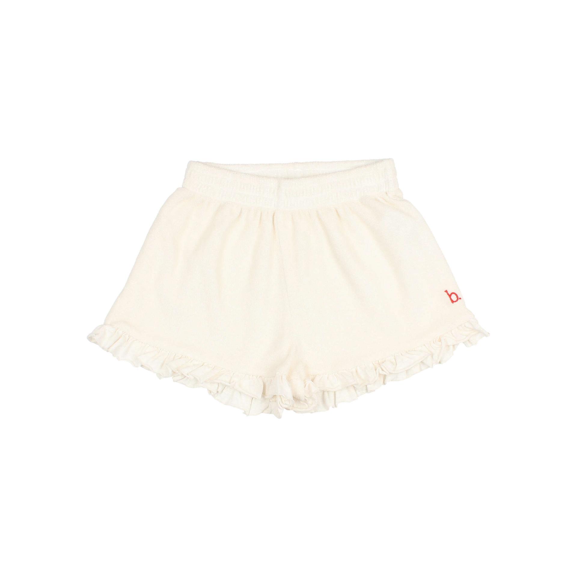 Pantalón corto de rizo suave con volante de punto liso algodón. Cintura elástica. Detalle bordado a contraste. 82% Algodón 18% Poliéster Reciclado. Fabricado en España