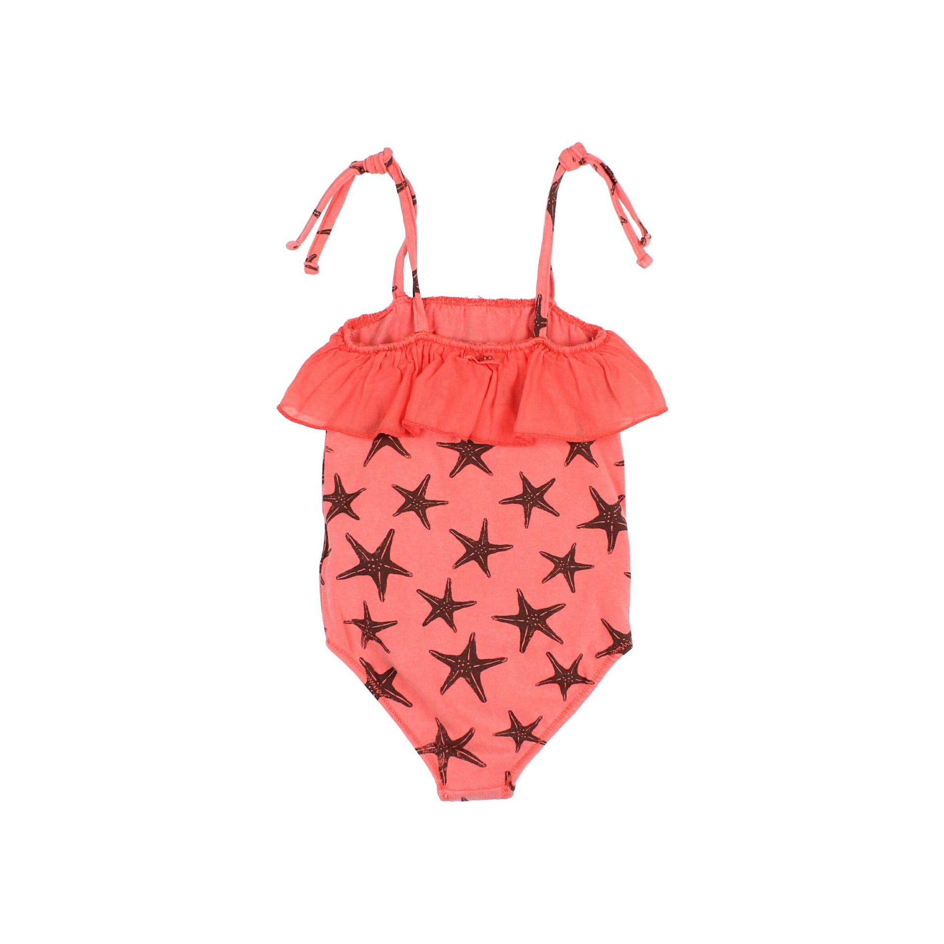 Maillot de algodón orgánico elástico con estampado starfish. Escote recto con volante de voile de algodón alrededor del pecho. Tirantes ajustables. 97% Algodón Orgánico, 3% Elastano. Forro: 100% Poliamida. Fabricado en España.