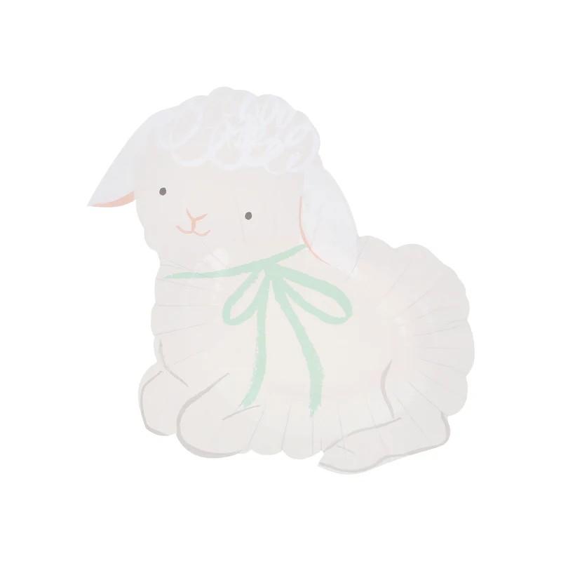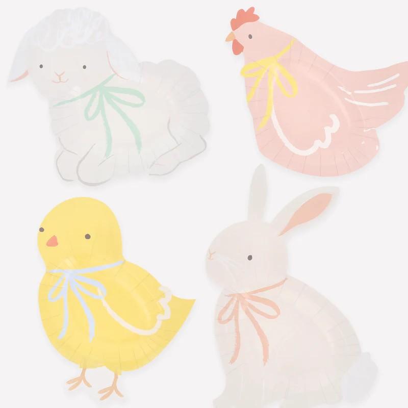 Ocho platos primaverales, con animalitos troquelados: conejitos, ovejotas, pollitos y gallinas todos adornados con lazos