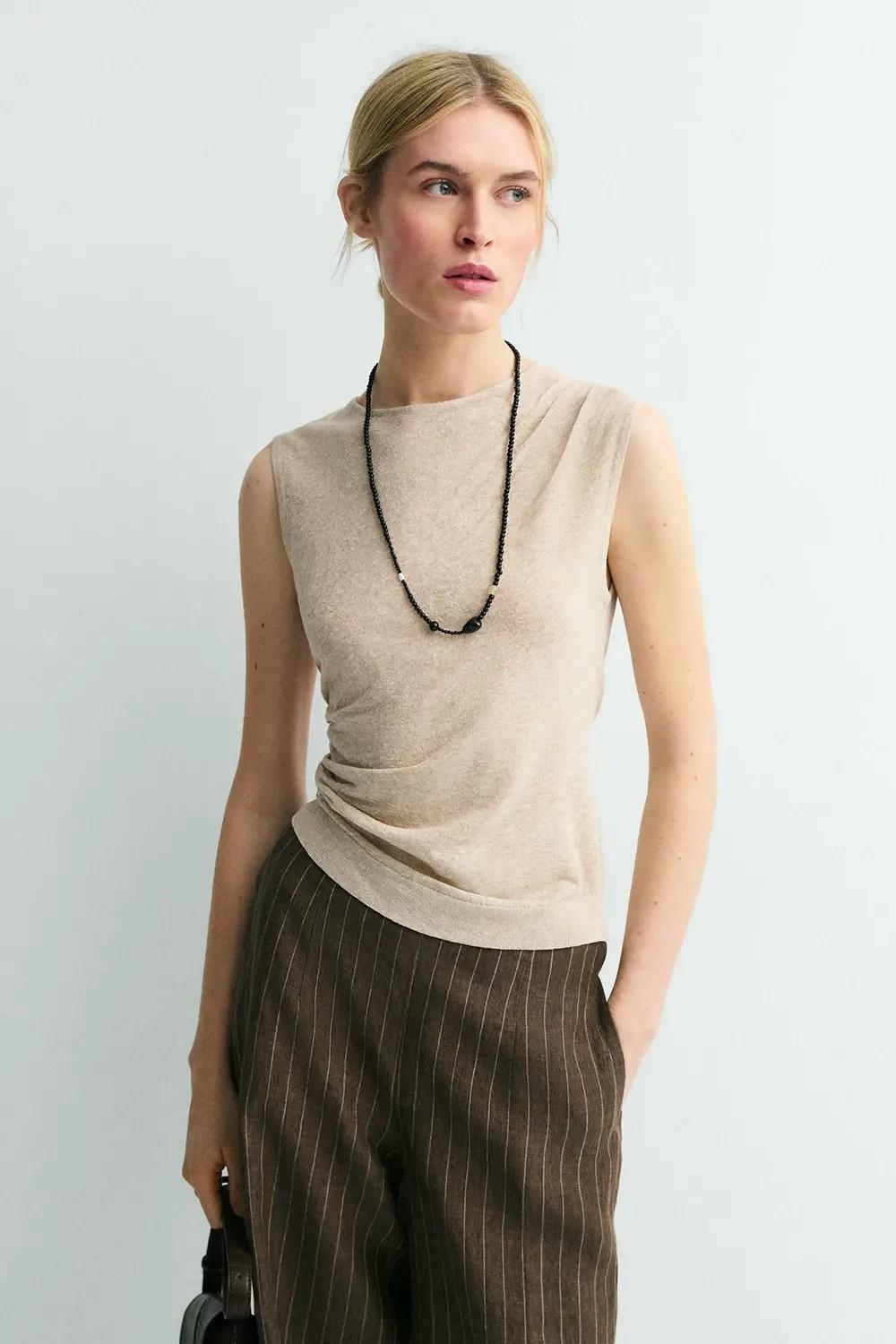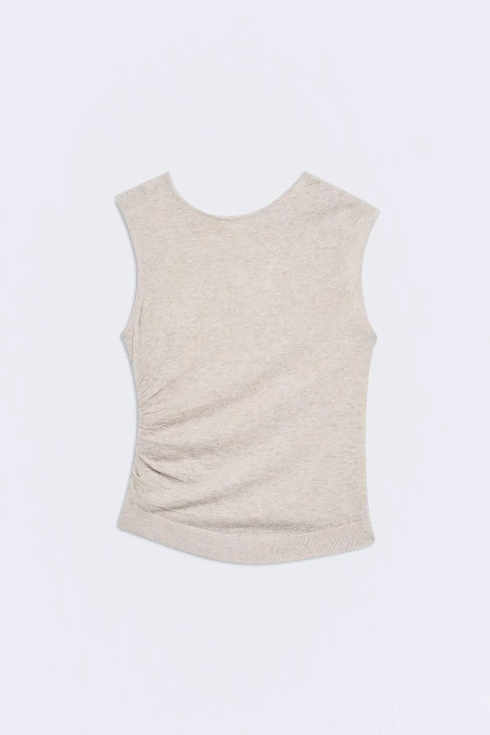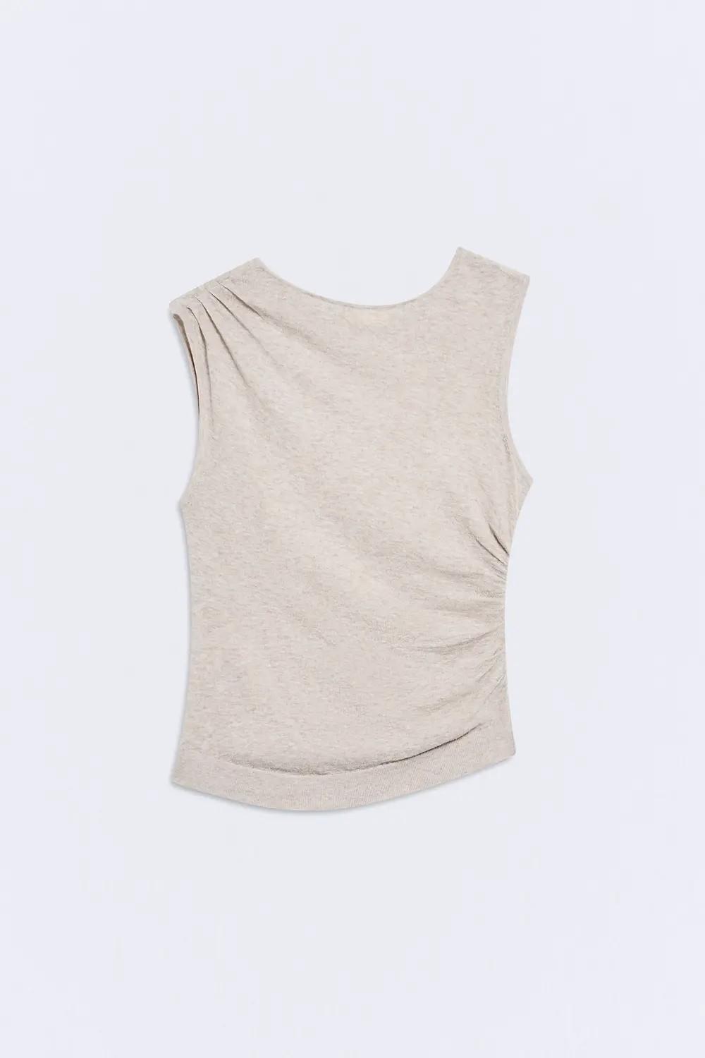 Diseñado sin mangas y con escote redondo, presenta frunces asimétricos que aportan un detalle diferencial a la silueta. El tejido es ligeramente transparente.