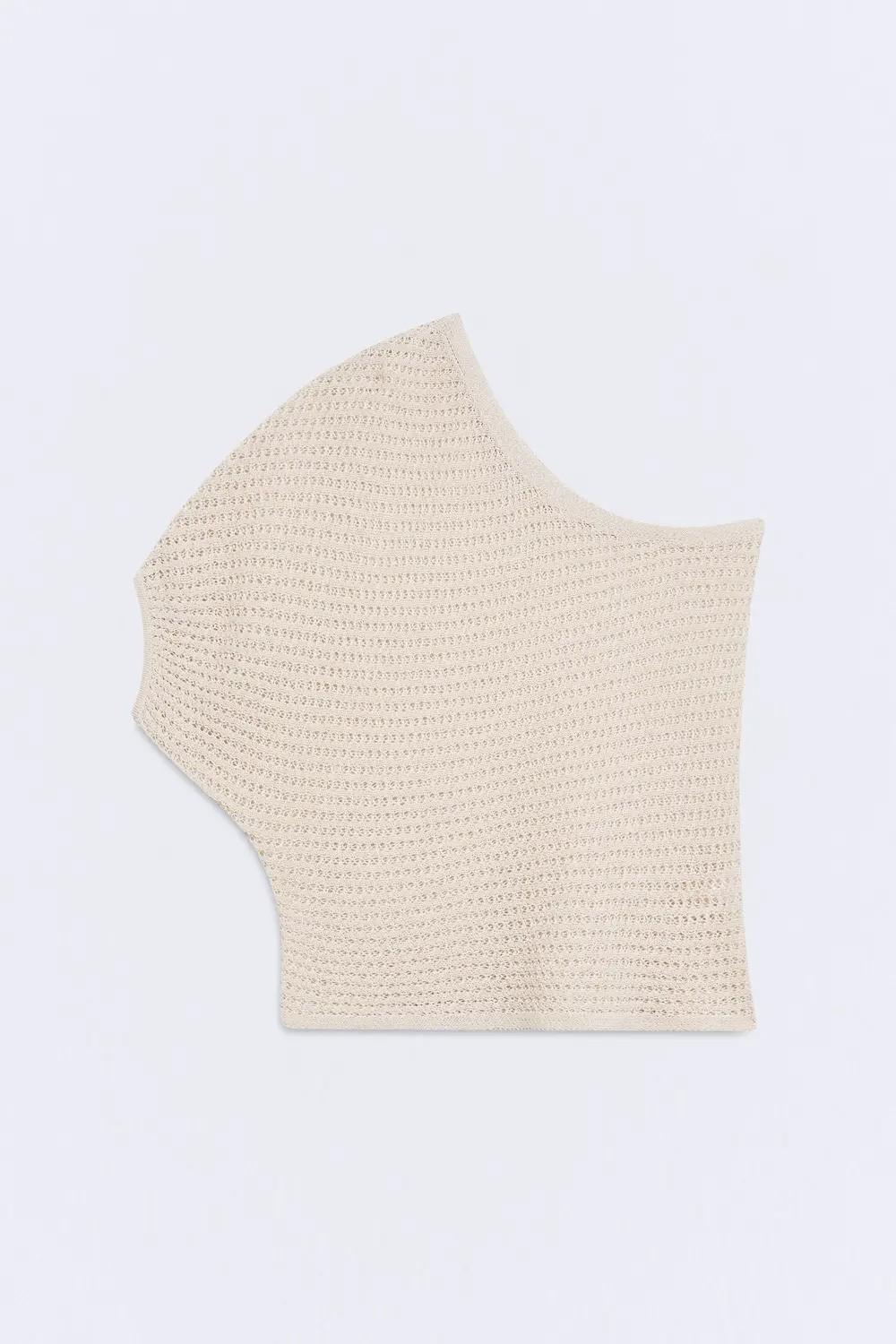 Diseñado con estructura calada y mangas asimétricas que aportan un detalle elegante a la silueta. Su tejido garantiza comodidad y versatilidad en cualquier look.