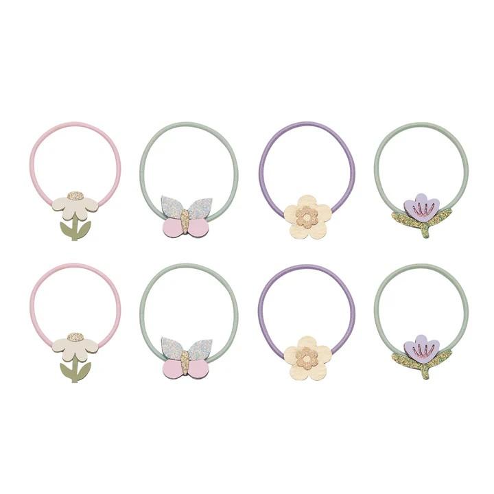 Este encantador conjunto de coleteros presenta delicadas flores y pequeñas mariposas en suaves tonos pastel, perfectos para agregar un toque de primavera a cualquier peinado.
