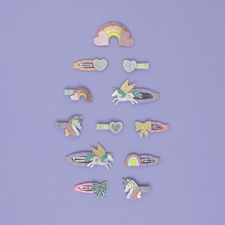Dale un toque de alegría a su cabello con nuestras mini pinzas Dreamy Unicorn. Estas pequeñas pinzas en una adorable y colorida paleta de colores pastel son perfectas para darle un toque mágico a cualquier look.