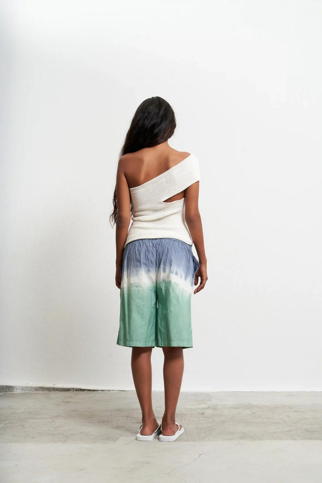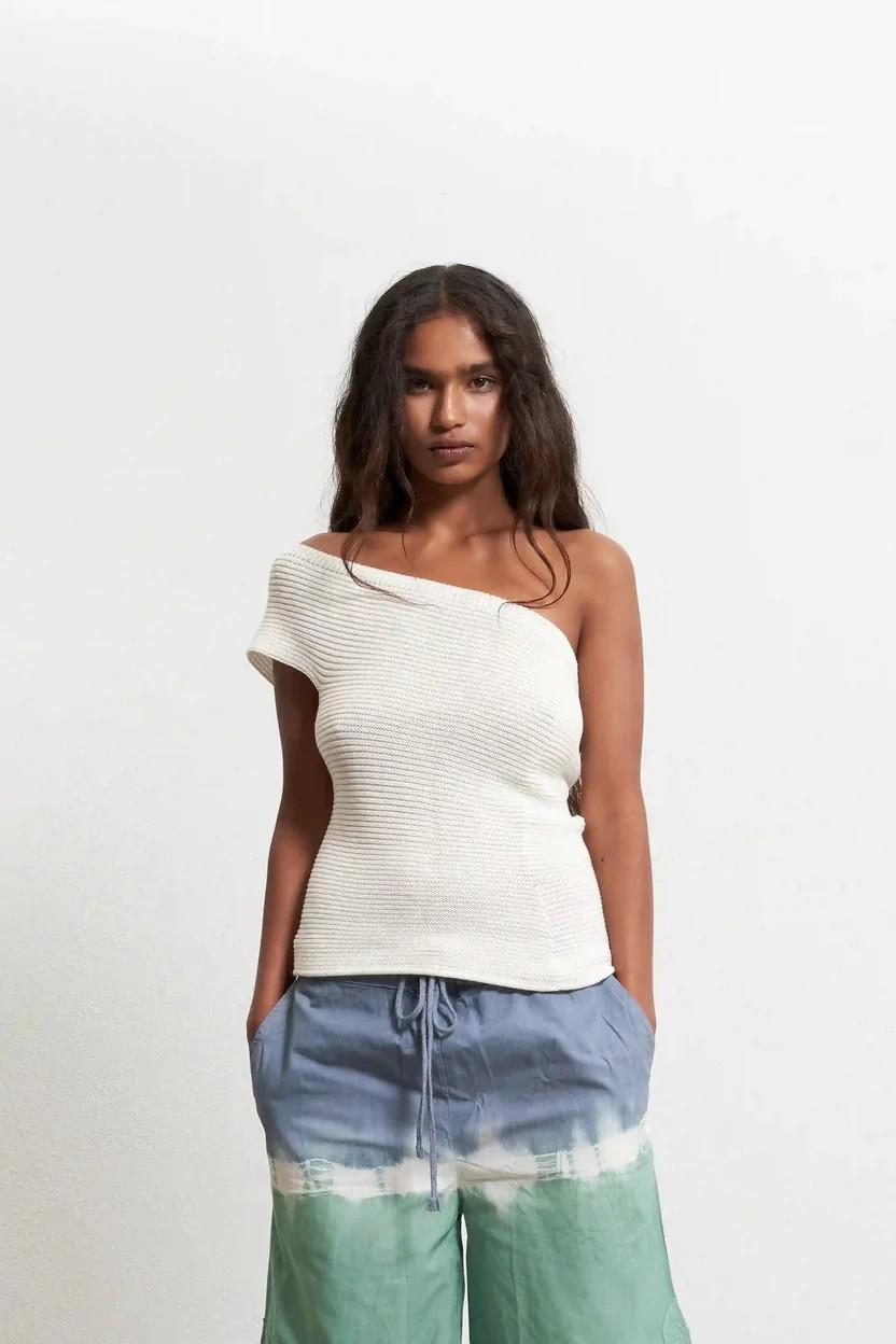Top de punto canalé con escote asimétrico y hombro descubierto en color blanco
