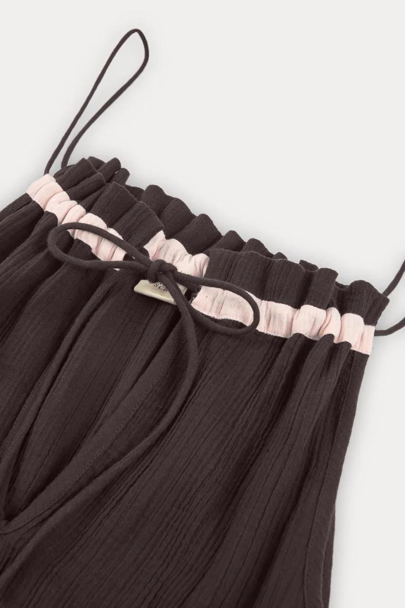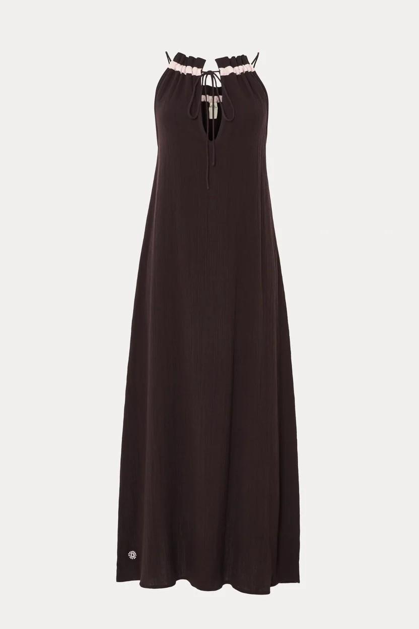Vestido largo de algodón con escote halter y lazada ajustable. Puede usarse con la lazada a la espalda o al delantero tal y como lo lleva Jamu.