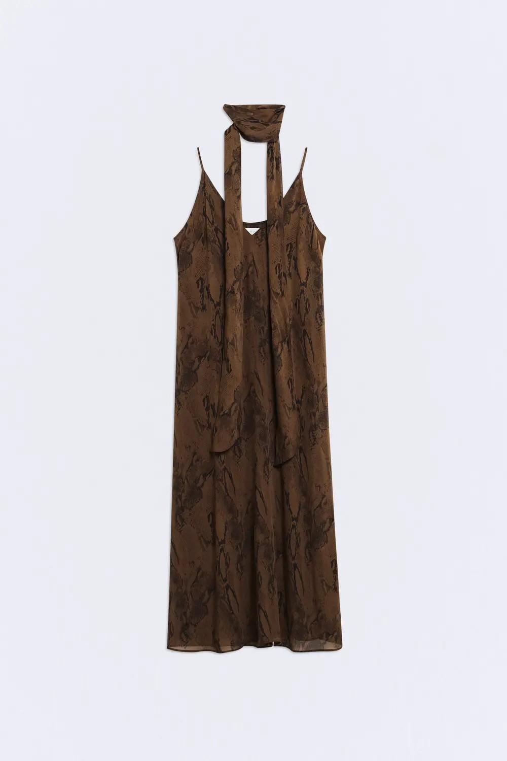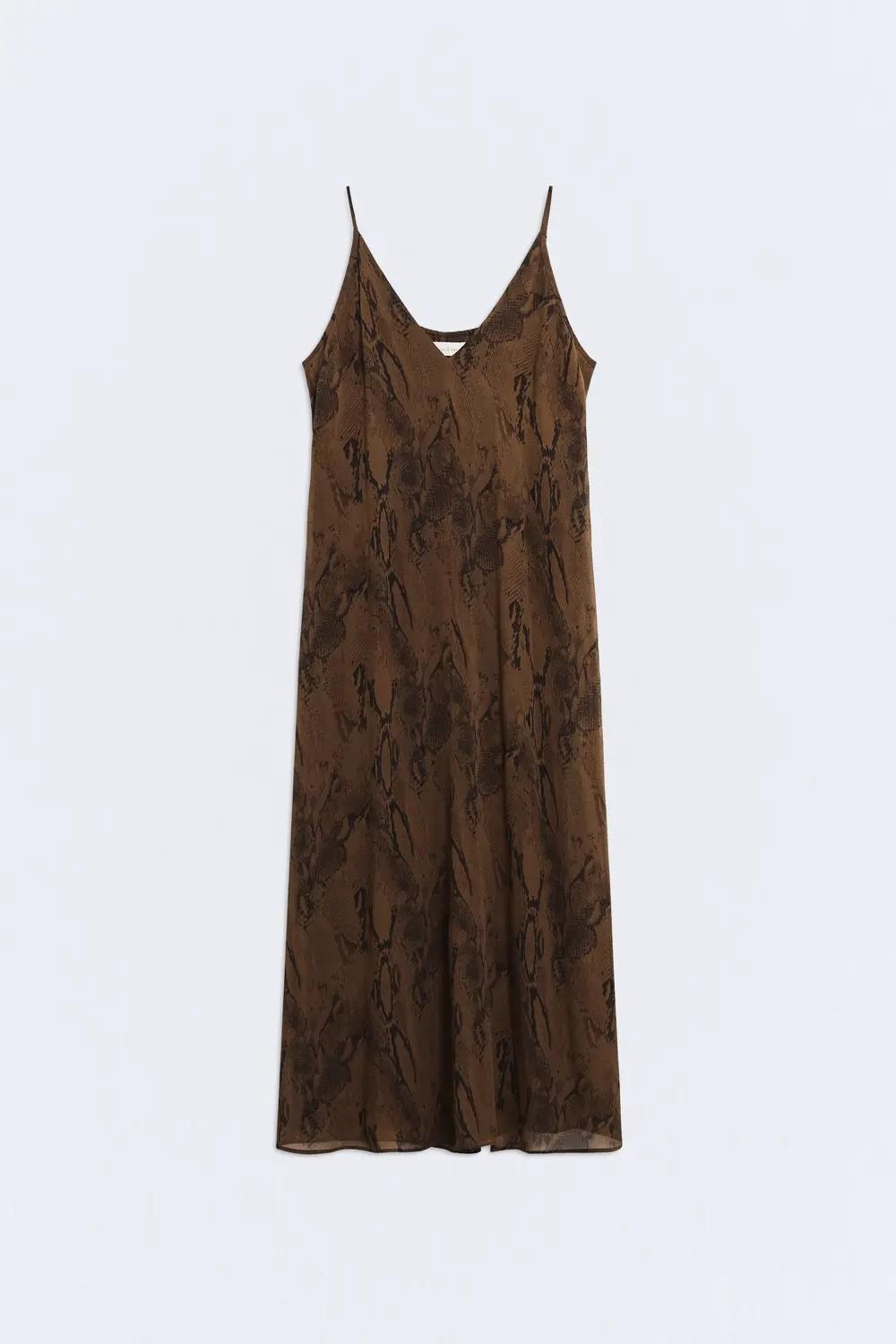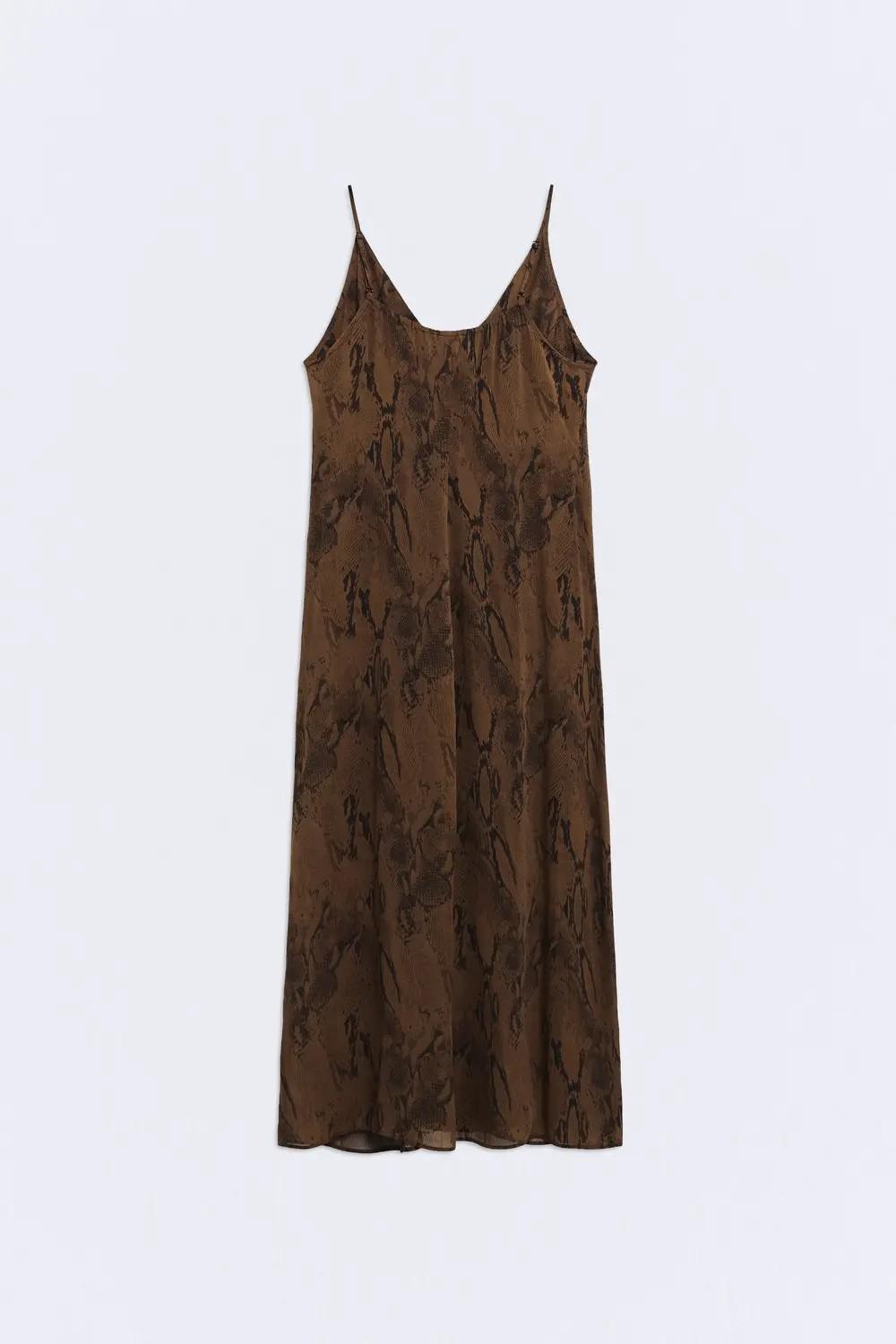 El vestido Nefertiti es una prenda ligera confeccionada en georgette de viscosa, un tejido fabricado en Italia que aporta caída y textura efecto rugosa, con fluidez y movimiento. Tiene forro interior y combina un tono marrón chocolate con un estampado efecto animal print.