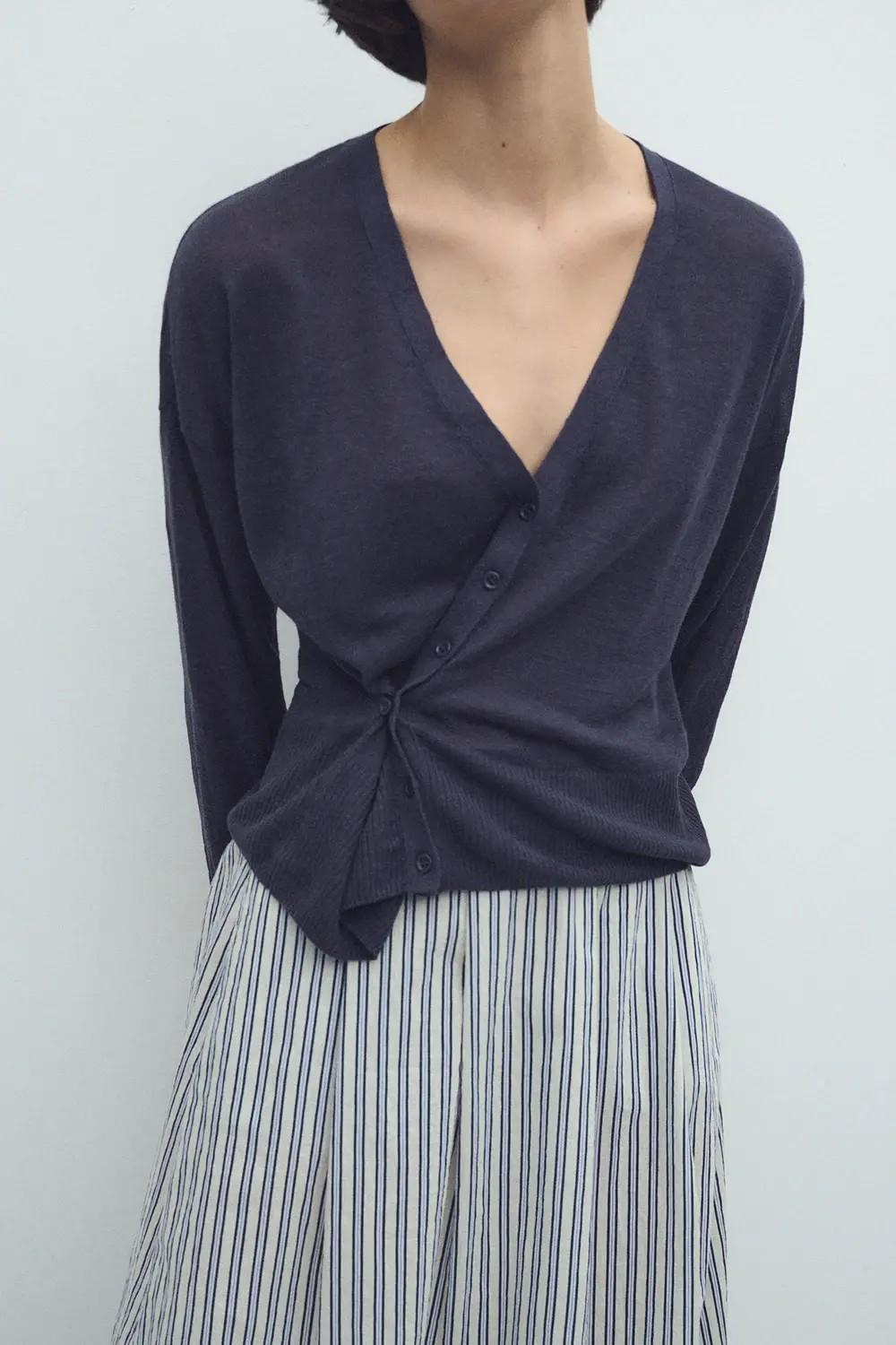 Cárdigan de tejido fino hecho de 100% lino. Con botonadura cruzada. Puños y bajo de la prenda a contraste. En color azul oscuro. Largo prenda para talla S: 53 cm.