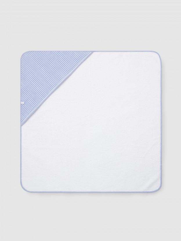 Toalla de baño en felpa de algodón con capucha en tejido seersucker a rayas y detalle de color en contraste.