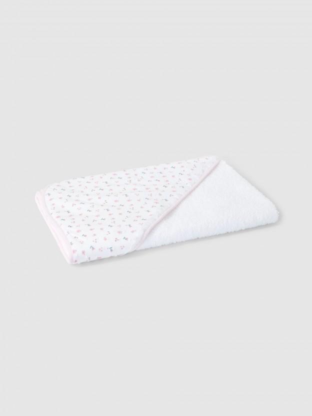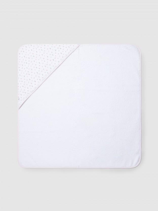 Toalla de baño en felpa de algodón con capucha en tejido estampado y detalle de volante con bordado exclusivo Laranjinha .