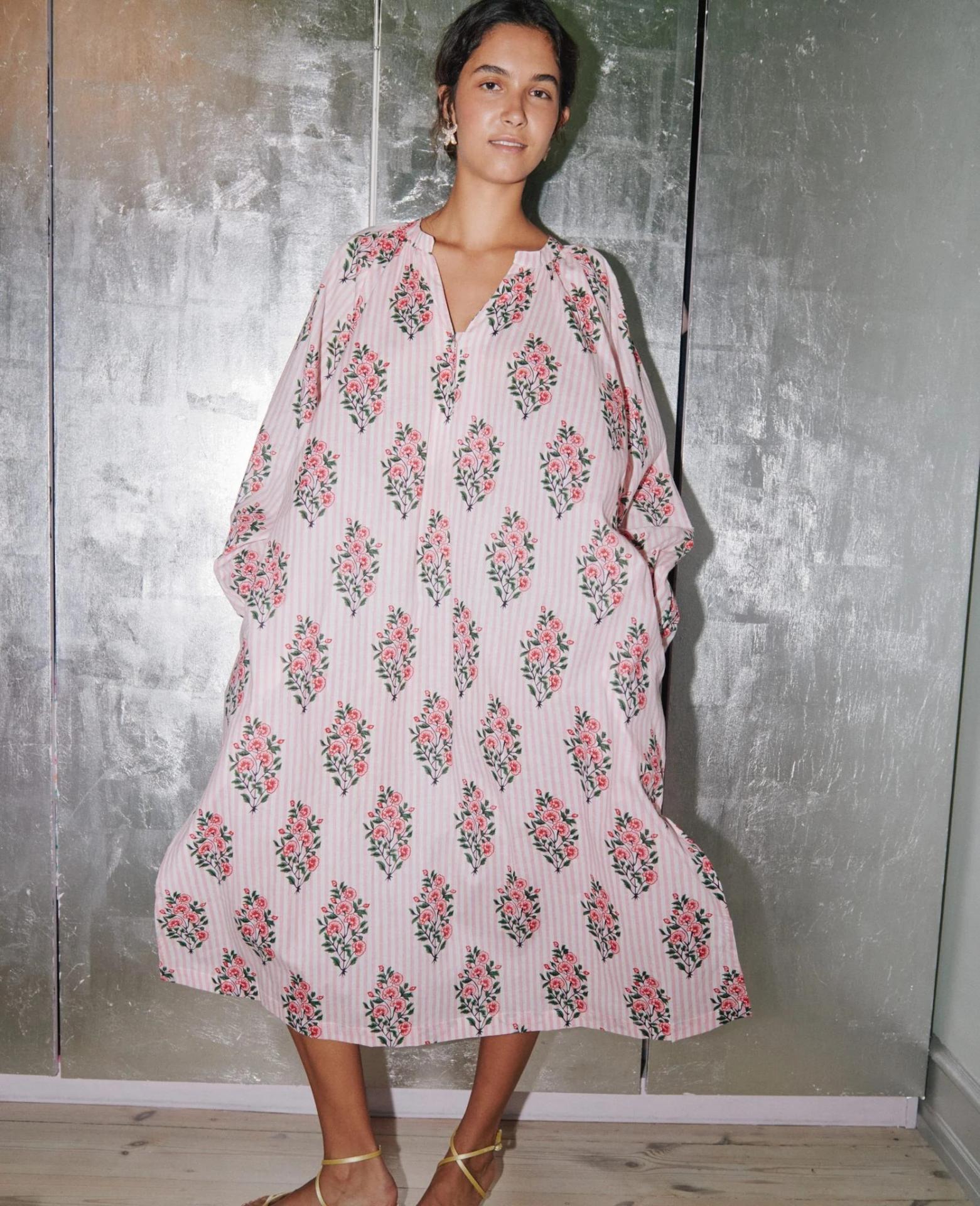 Nuestro vestido Lara presenta un estampado artesanal realizado con bloques de madera. Dado que cada motivo se estampa a mano, es normal que la prenda presente variaciones, pequeñas motas o imperfecciones.