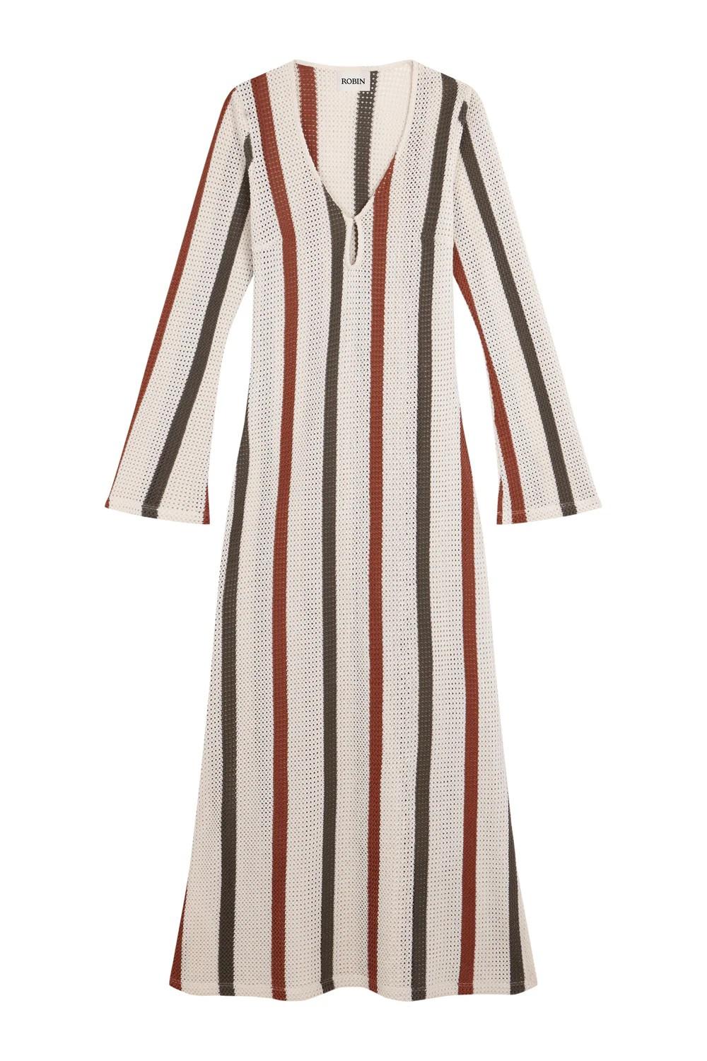Vestido Rodas de crochet de color crudo a rayas en tonos verde y terracota.