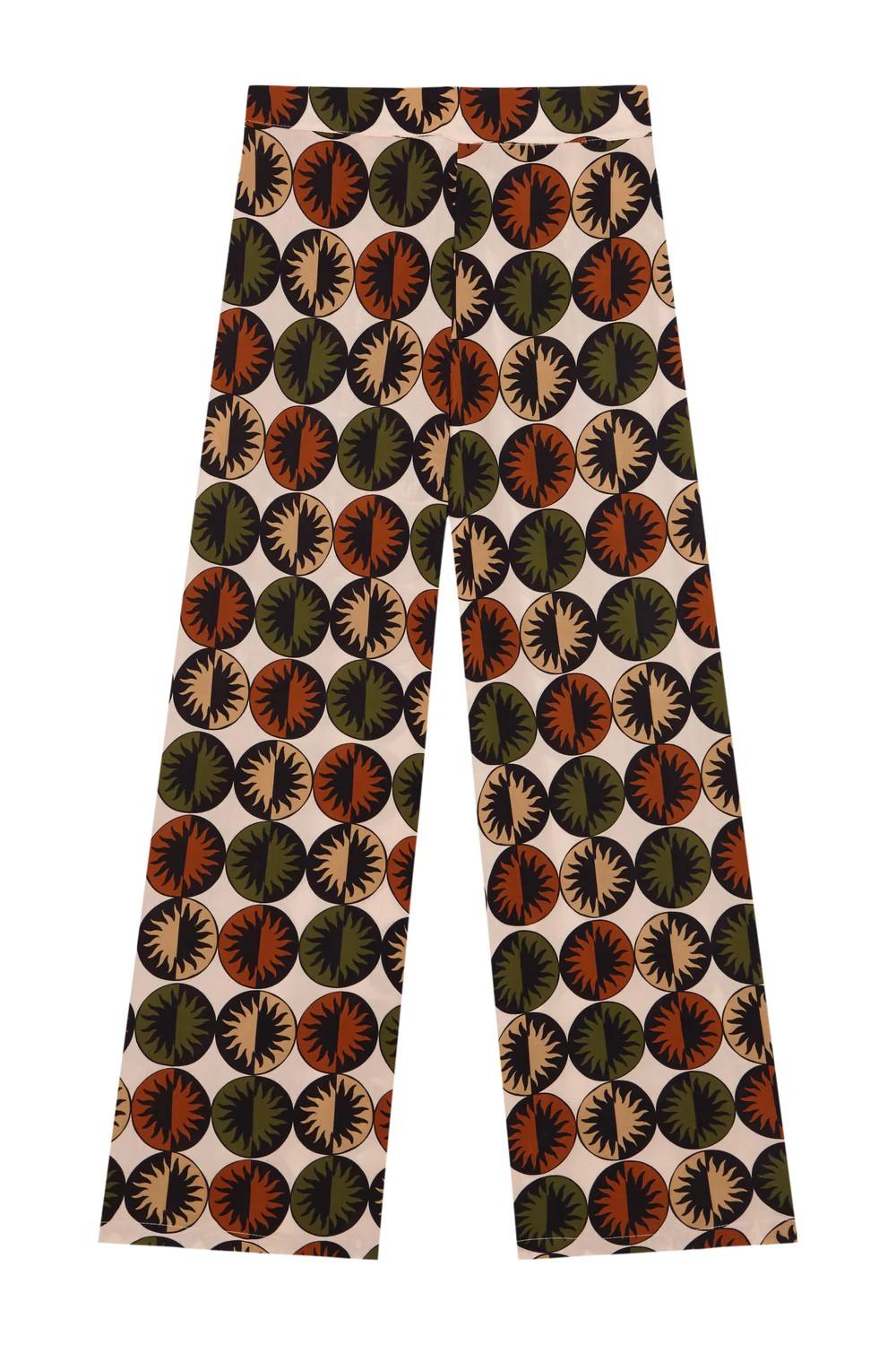 Pantalón Taormina con estampado de soles en tonos verde, terracota, negro y blanco.