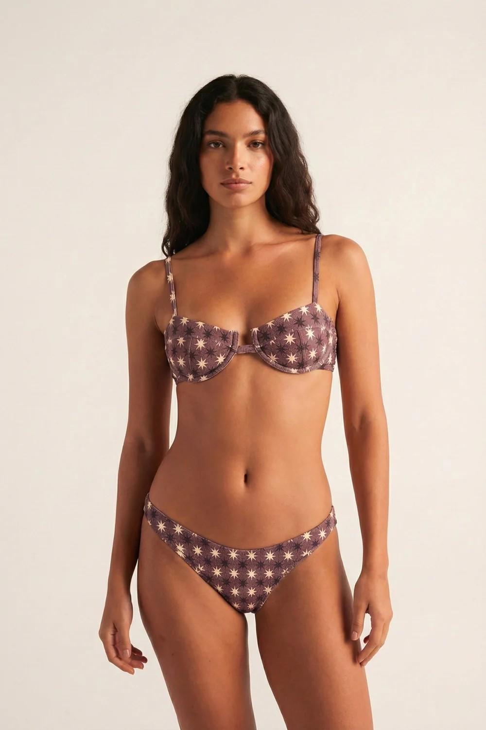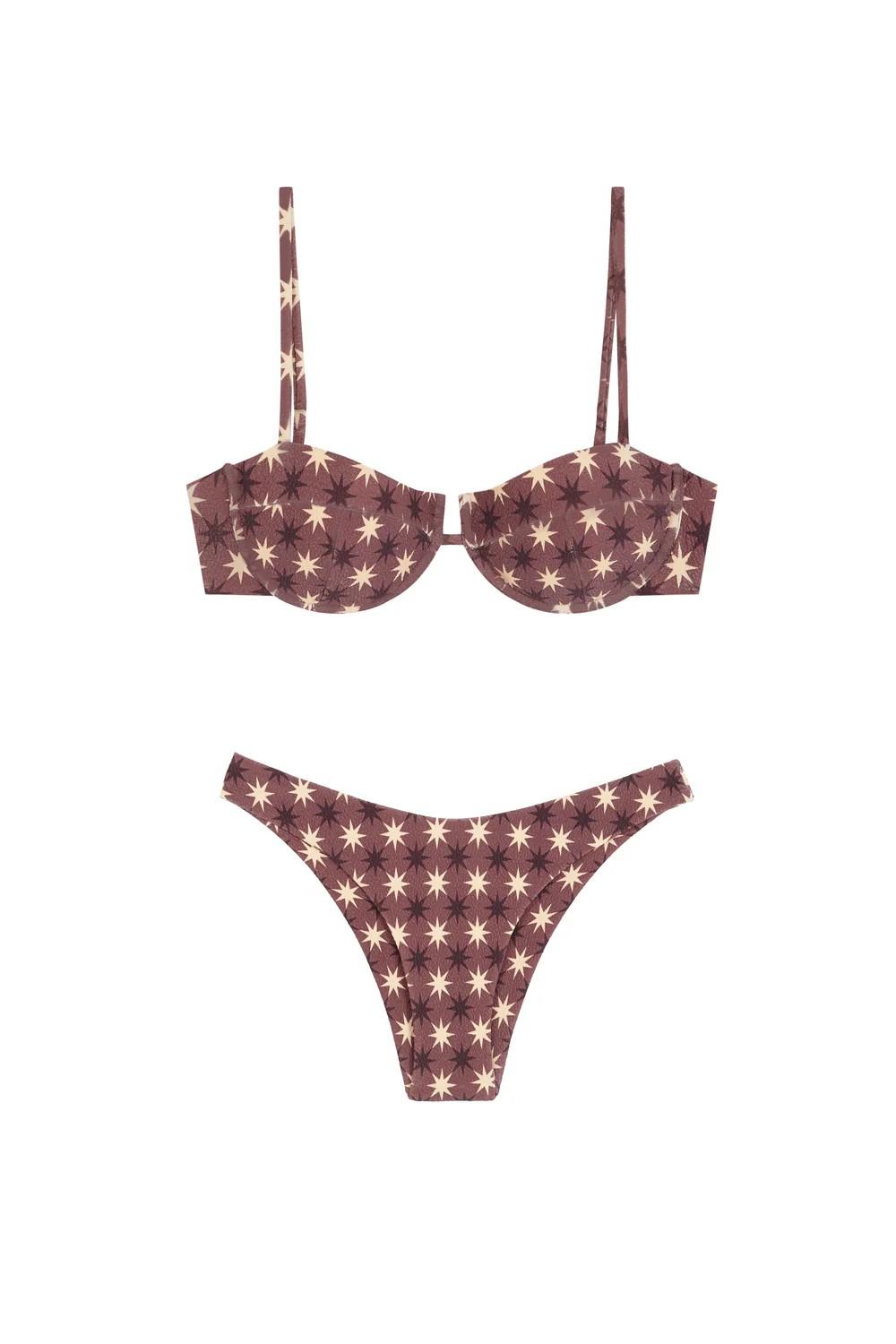 Bikini balconette con braga brasileña en estampado de estrellas en tonos crudo y marrón oscuro sobre fondo marrón en estructura.