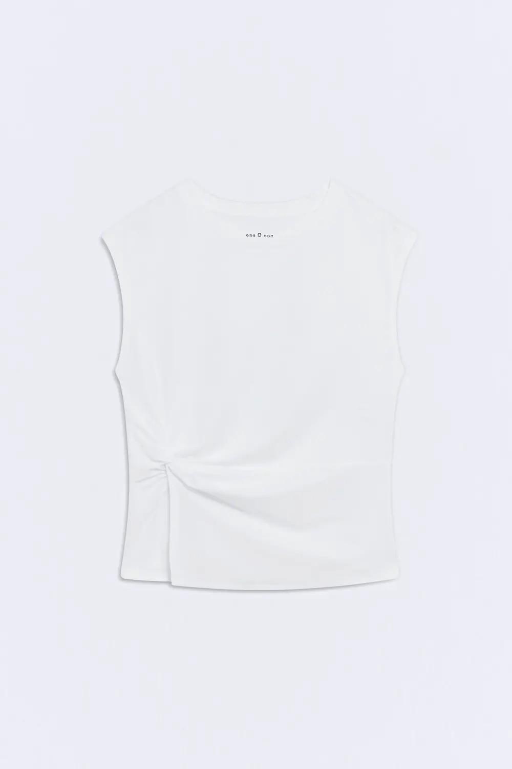 Diseñada con manga corta y detalle de nudo en la cintura, ofrece un tejido suave y agradable que combina confort y estilo. Su silueta favorecedora y ligeramente ajustada aporta un toque moderno a un básico imprescindible.