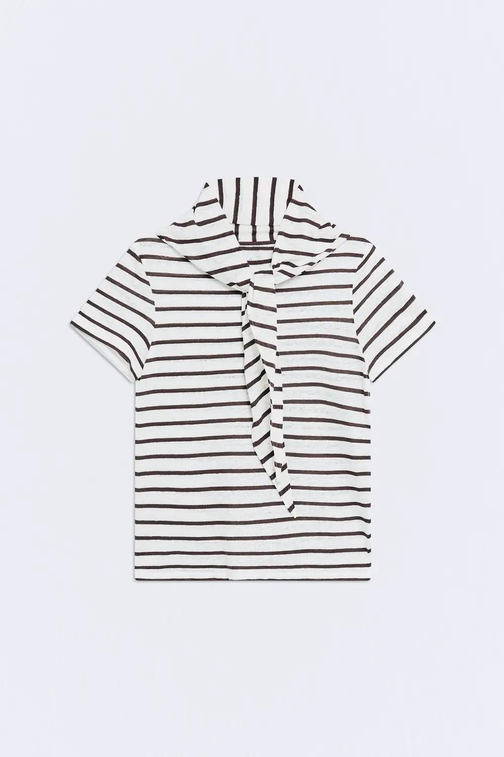 Diseñada con manga corta, cuello redondo y embudo a contraste en el escote, ofrece un tejido fino y transpirable que aporta comodidad y suavidad. Su silueta versátil y ligera la convierte en un básico con estilo, mientras que el pañuelo a juego, disponible por separado, añade un detalle coordinado y moderno.