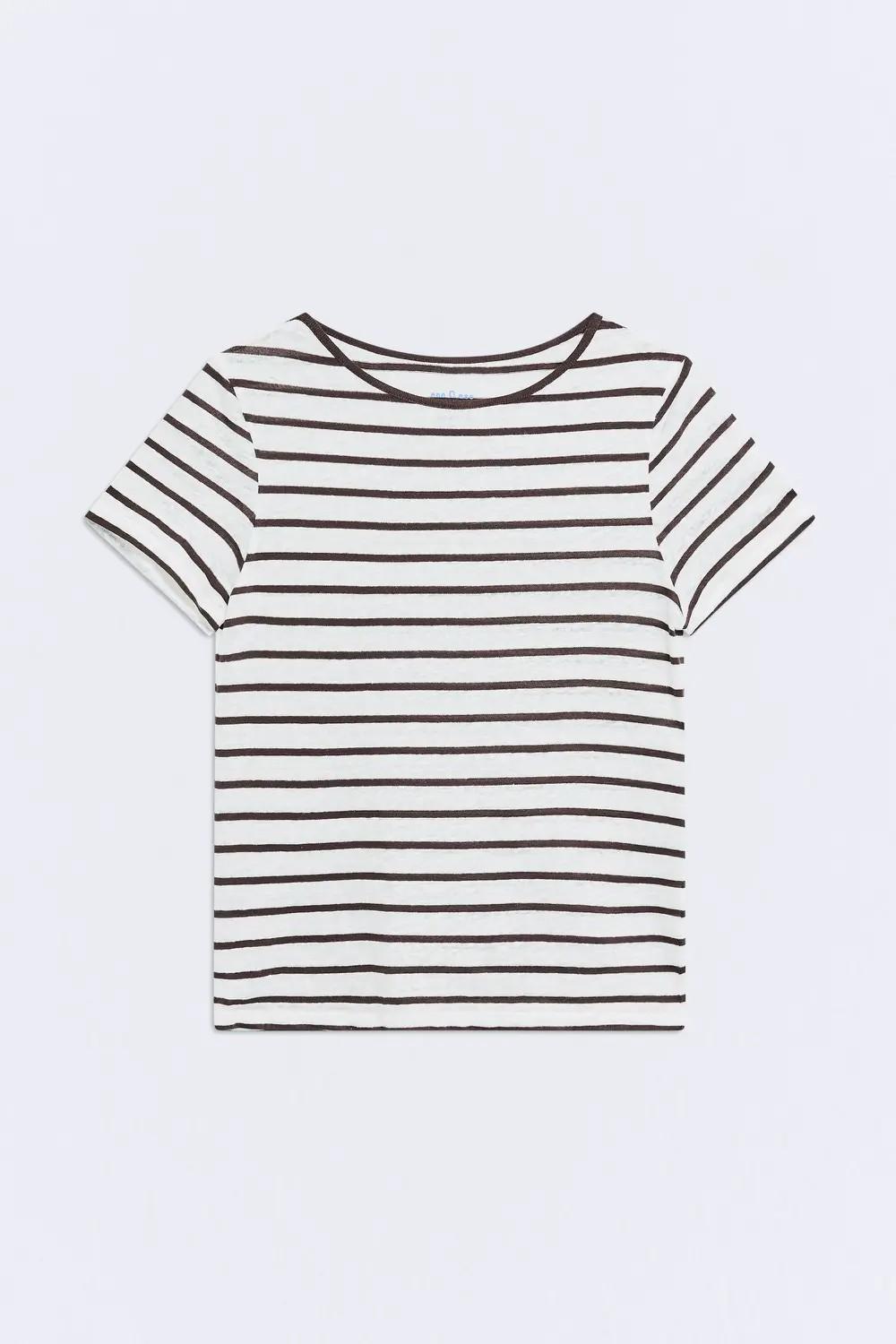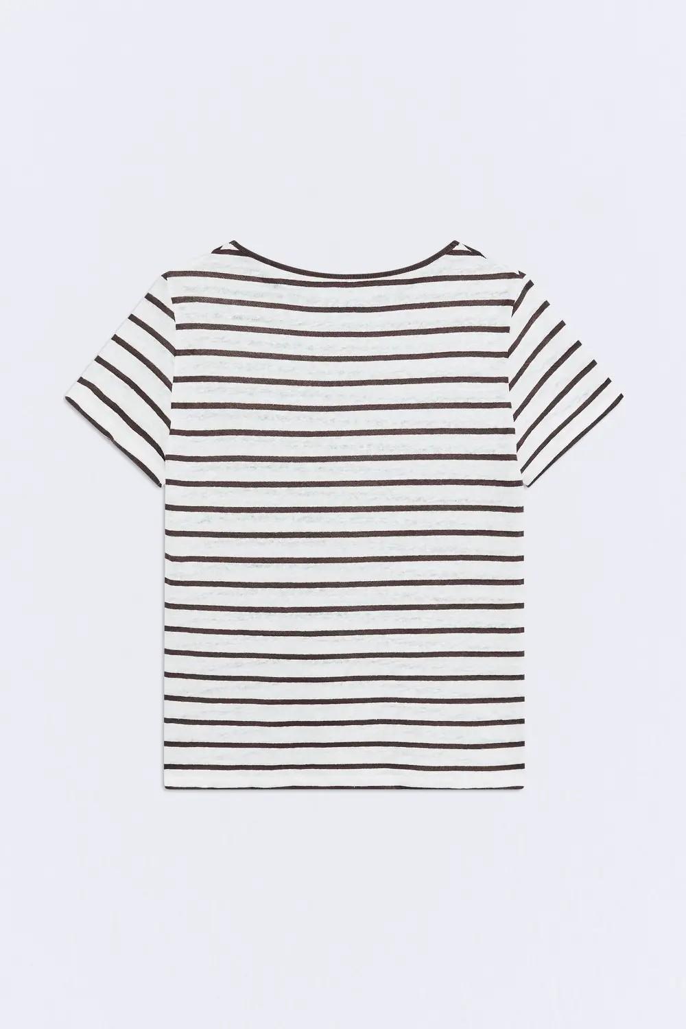 La camiseta Begur es una prenda ligera y fresca confeccionada en mezcla de lino y algodón, en color blanco con rayas marrones, fabricada en Portugal.