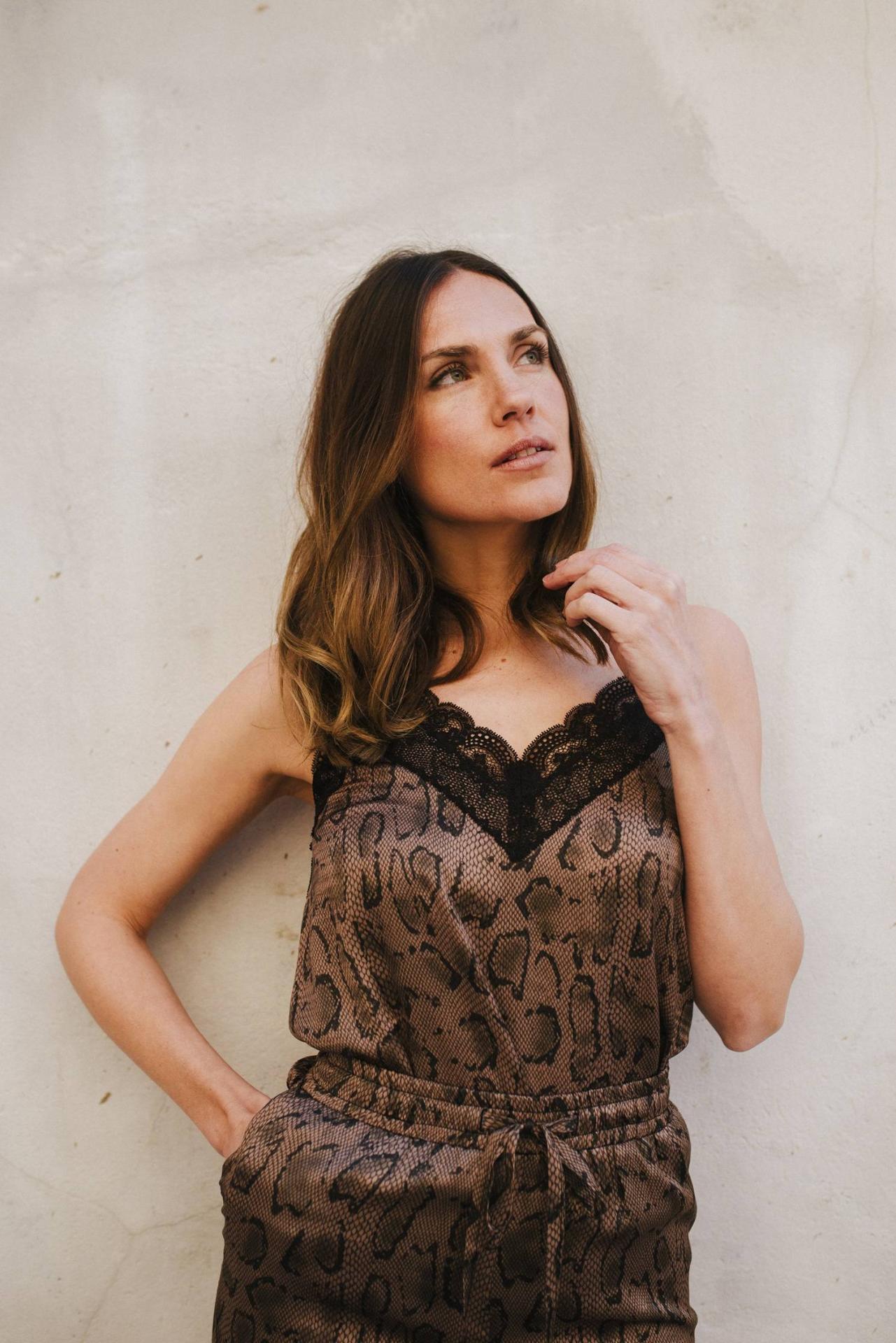Cuerpo lencero en estampado snake de tono marrón con escote de encaje en pico y tirante fino ajustable. Es un básico ideal para combinar con tus prendas en cashmere. Colores: Kaki y Mocca. Composición: 100% poliester. Nuestras piezas se fabrican en nuestros talleres en España. Cuidado de las prendas: Lavado a mano en frío o en programa para prendas delicadas. Planchado del revés y a baja temperatura. Largura desde el comienzo de la puntilla en la parte central 40 cm (talla S).