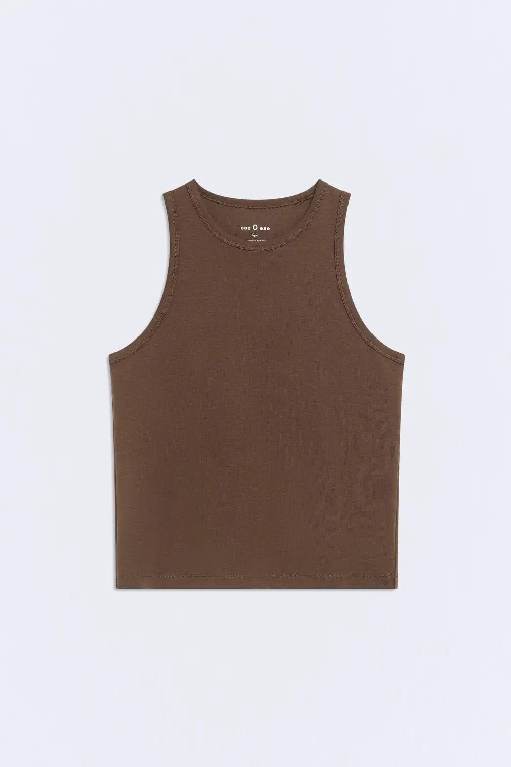 El top Zoe es una prenda confeccionada en algodón orgánico, en color marrón chocolate, que combina comodidad y estilo en un diseño básico chic.