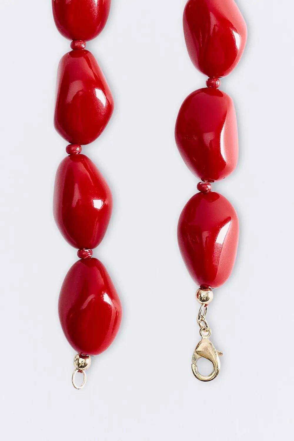 Collar de piedras en forma geométricas con nudo entre cada una de ellas. En color rojo. Con charm de piedra blanca. Medidas: 52 + 7 cm de cadena ajustable.