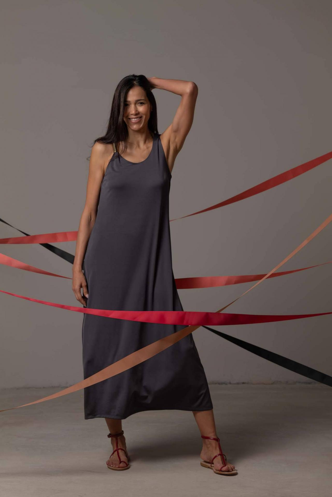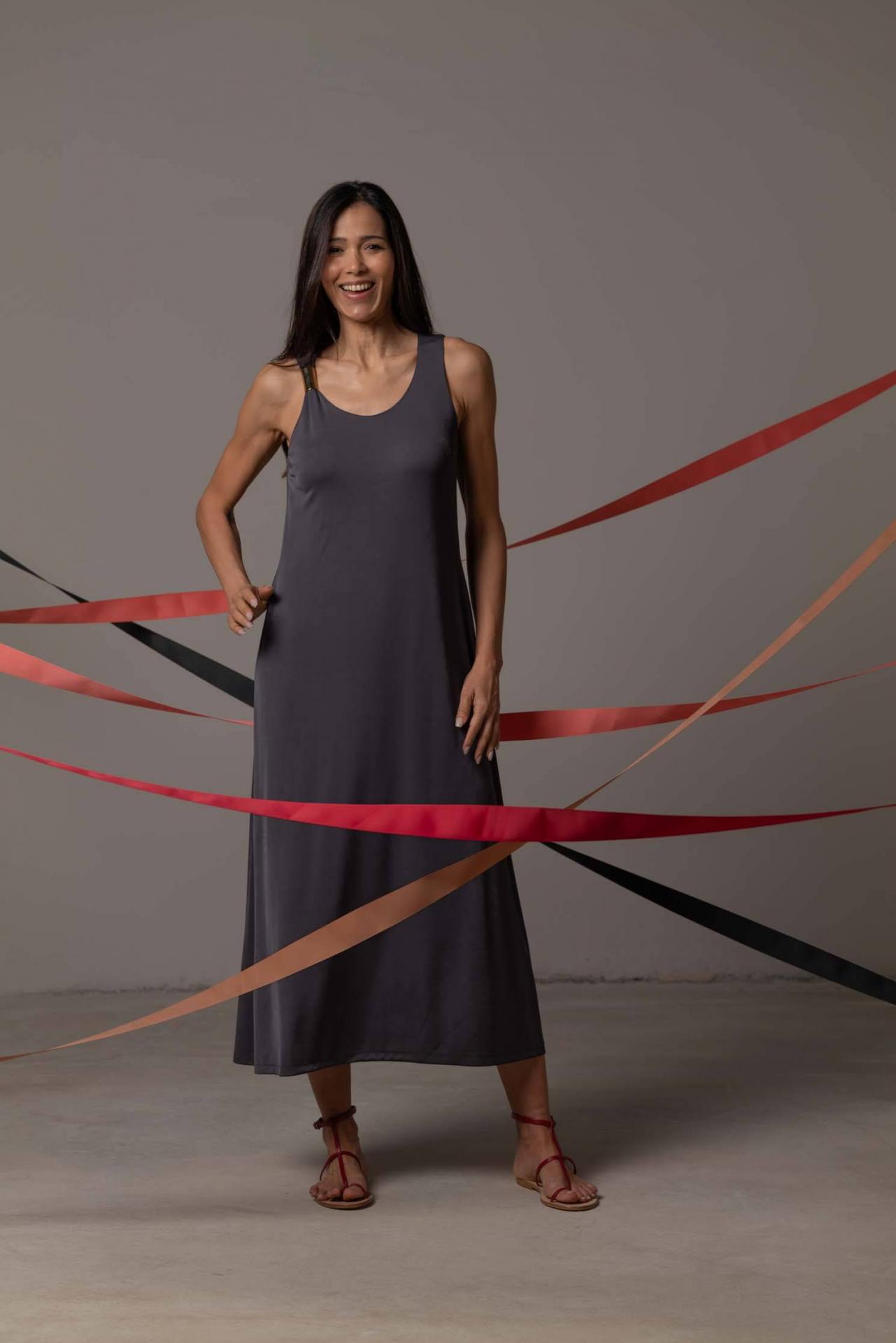 Vestido largo en nuestro clásico punto fluido con detalle dorado. Este modelo emana elegancia a través de su simplicidad. Será tu mejor aliado perfecto para los días más especiales. Combínalo con nuestra blazer Laurent. Composición: 97% poliester y 3% elastán Tejido fluido Colores disponibles: negro y plomo. La modelo mide 1,76 cm y lleva talla S. Pecho: 80 cm Cintura: 63 cm Cadera: 96 cm